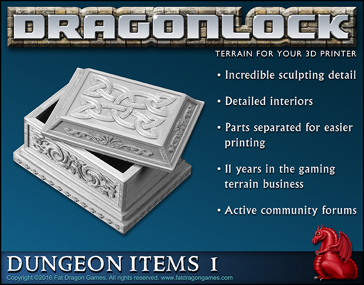 DRAGONLOCK™ Ultimate a 3D printable dungeon tile system that allows you to create fully modular, snap-lock, multi-level 28mm scale dungeon terrain for your RPG or wargame on your home 3D printer. Individual pieces links to neighboring pieces with our exclusive Dragonbite™ clips. Each 3D printable scenery set is delivered as a downloadable .stl file, and once you have the set, you can print as many pieces as you like and never run out or need to purchase more. A standard 3D dungeon tile piece costs around 40 cents in plastic to print yourself, far cheaper than factory made terrain! All of the models shown were printed at 150-200 micron resolution, a common standard on most economical 3D printers. A nice starter printer that can print these files starts around $220 (see our F.A.Q. for more info on printers, printing costs, filaments, and more, over on the FDG website forums.)